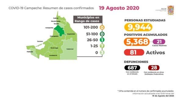 En todo Campeche 5,368 positivos y 4,508 se han recuperado.