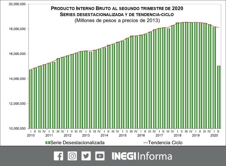 El Instituto Nacional de Estadística y Geografía (Inegi) confirmó la mayor caída de la actividad económica de la que hay registro en México. En el segundo trimestre de 2020, el producto interno bruto (PIB) cayó 18.68 por ciento a tasa anual. La cifra se encuentra por debajo del dato oportuno publicado el 30 de julio pasado, que fue de 18.9 por ciento.