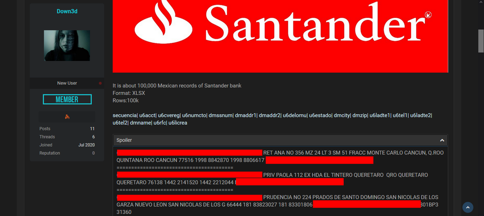 La empresa de ciberseguridad Hals Intelligence alerta en su pagina de facebook, https://www.facebook.com/halsintelligence la venta de una base de datos con 100 mil numero de cuentas, nips y datos financieros del Banco Mexicano Santander.