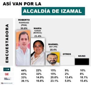 Cuatro encuestadoras dan amplio margen de triunfo al panista Roberto Rodríguez en su búsqueda por convertirse en el Presidente Municipal de Izamal, con una diferencia promedio de 18.4%, en superioridad con su rival más cercano que es María Karam, del partido Morena.