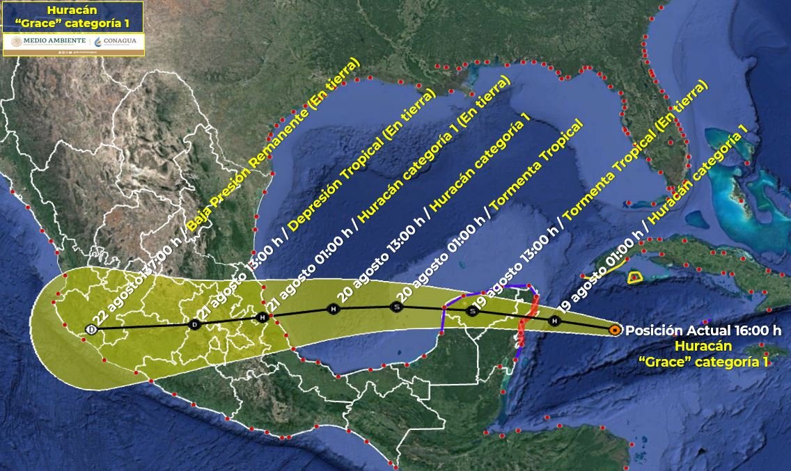 El centro del huracán “Grace” de categoría 1 en la escala Saffir-Simpson mantiene su desplazamiento con dirección a la Península de Yucatán. Se pronostica durante la tarde-noche vientos con rachas muy fuertes y oleaje elevado en las costas de Yucatán y Quintana Roo, así como lluvias muy fuertes a puntuales torrenciales en la Penísnula de Yucatán. Se mantiene en vigilancia.