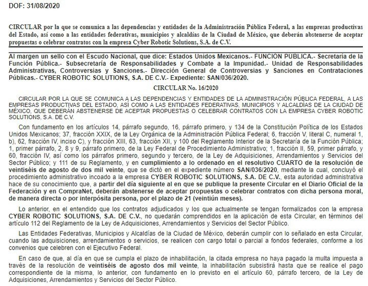 Con esta sanción, publicada este lunes en en Diario Oficial de la Federación, la compañía estará inhabilitada por 21 meses y tendrá que pagar una multa de 887 mil 145 pesos.