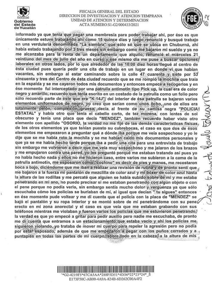 José Eduardo Ravelo declaró ante la Fiscalía de Yucatán, el pasado 24 de julio, que sus primeros agresores fueron elementos de la Policía estatal, quienes «lo esposaron como cochino» y golpearon hasta hacerle vomitar sangre.