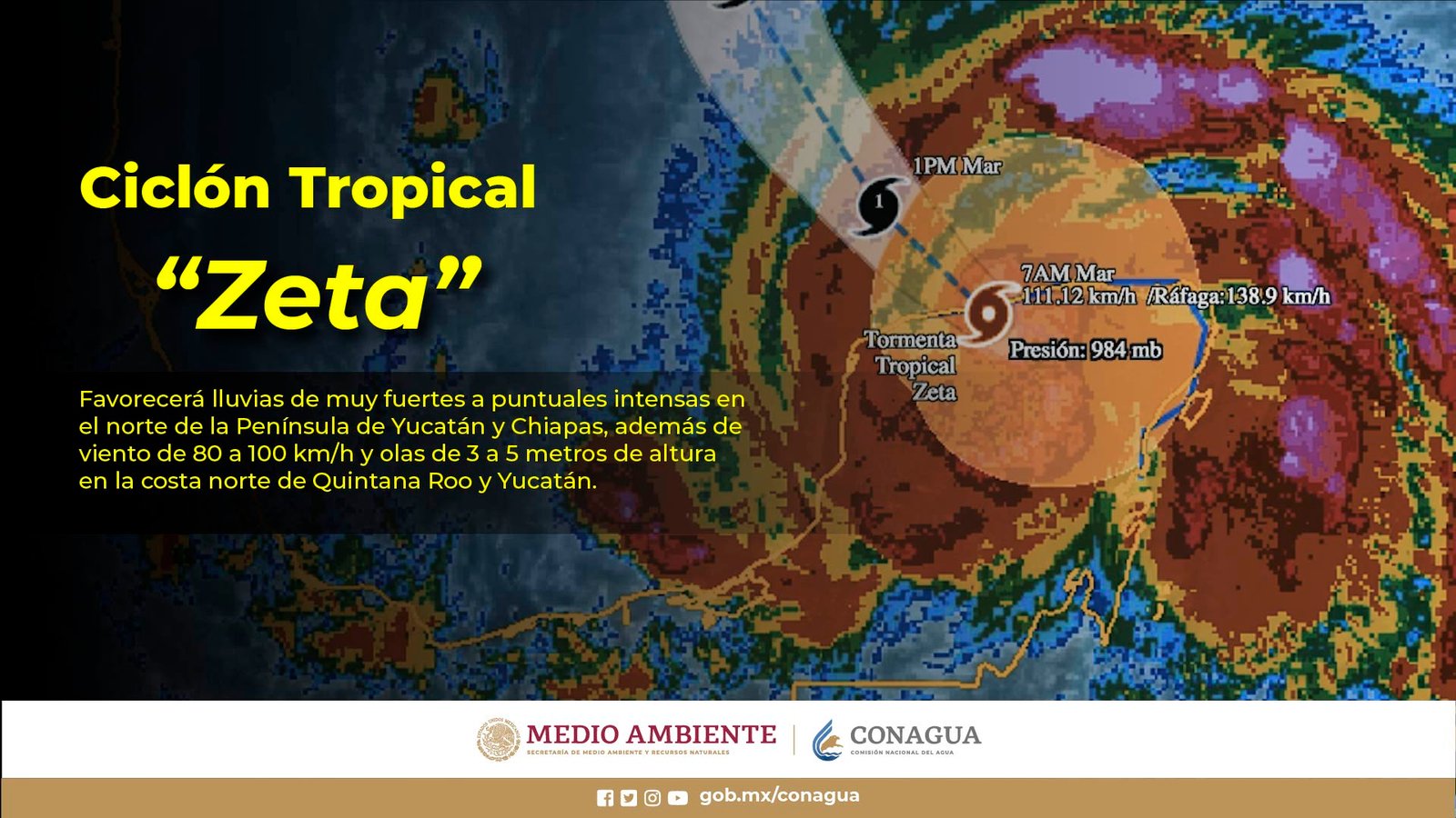 A las 06:00 horas, tiempo del centro de México, el centro de Zeta se localizó en tierra